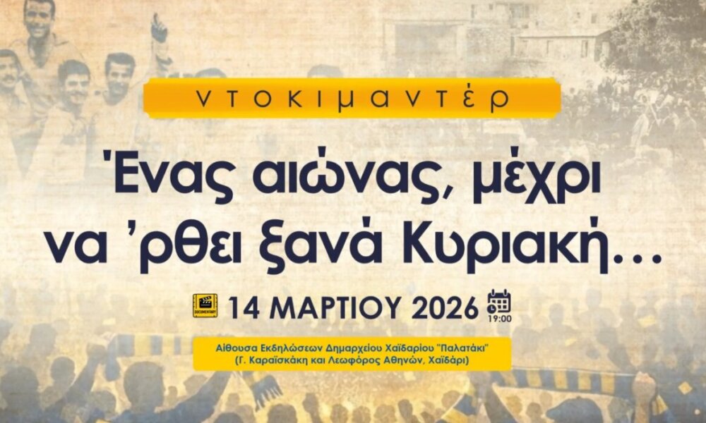 Το Σάββατο, 14 Μαρτίου 2026 στις 19:00, στην Αίθουσα Εκδηλώσεων Δημαρχείου Χαϊδαρίου «Παλατάκι» (Γ. Καραϊσκάκη και Λεωφόρος Αθηνών, Χαϊδάρι), καλούμε τους Αγρινιώτες, τους Αιτωλοακαρνάνες, τους φίλους του Παναιτωλικού να παρακολουθήσουν το ντοκιμαντέρ: «Ένας αιώνας μέχρι να ‘ρθει ξανά Κυριακή».