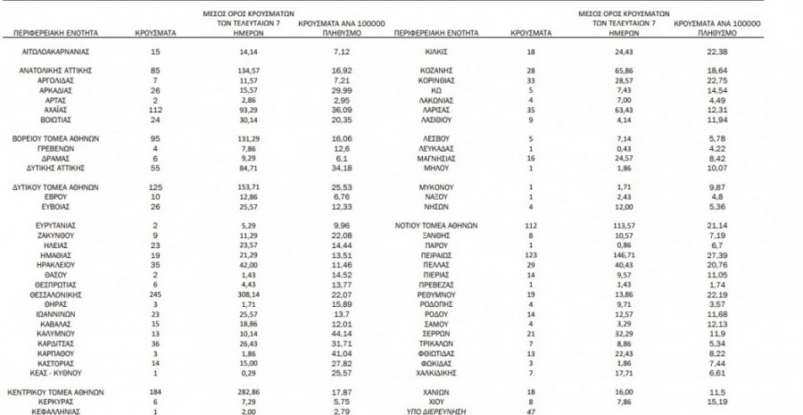 - Η κατανομή των 1.846 νέων εγχώριων κρουσμάτων ανά Περιφερειακή Ενότητα παρουσιάζεται στον κατωτέρω πίνακα.