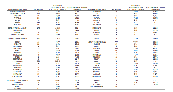 - Η κατανομή των 3.065 νέων εγχώριων κρουσμάτων ανά Περιφερειακή Ενότητα παρουσιάζεται στον κατωτέρω πίνακα