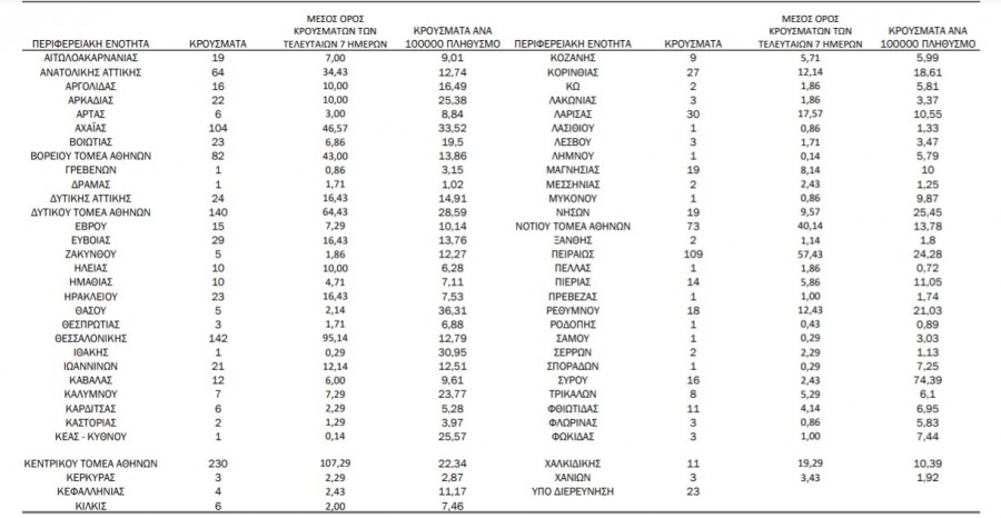 εκ των οποίων 2 εντοπίστηκαν κατόπιν ελέγχων στις πύλες εισόδου της χώρας. Η κατανομή των 1.455 νέων εγχώριων κρουσμάτων ανά Περιφερειακή Ενότητα παρουσιάζεται στον κατωτέρω πίνακα: