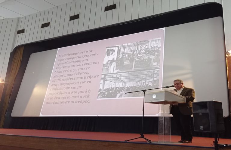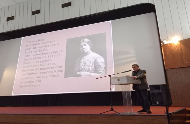 - Στην εκδήλωση, ομάδα μαθητών παρουσίασε μία σύντομη ιστορική αναδρομή των αγώνων για τη χειραφέτηση των γυναικών και τον καθορισμό της 8ης Μαρτίου ως Παγκόσμιας Ημέρας της Γυναίκας.