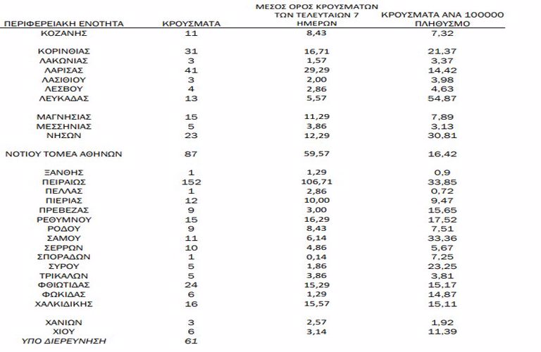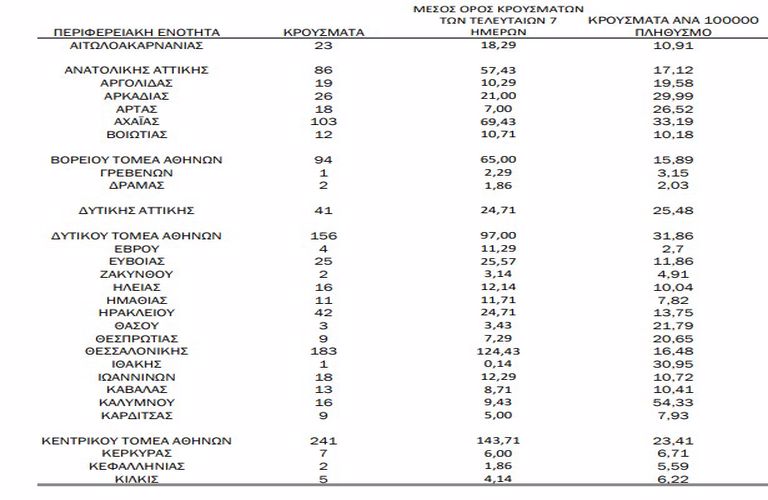 - Η κατανομή των 1.771 νέων εγχώριων κρουσμάτων ανά Περιφερειακή Ενότητα παρουσιάζεται στον κατωτέρω πίνακα.
