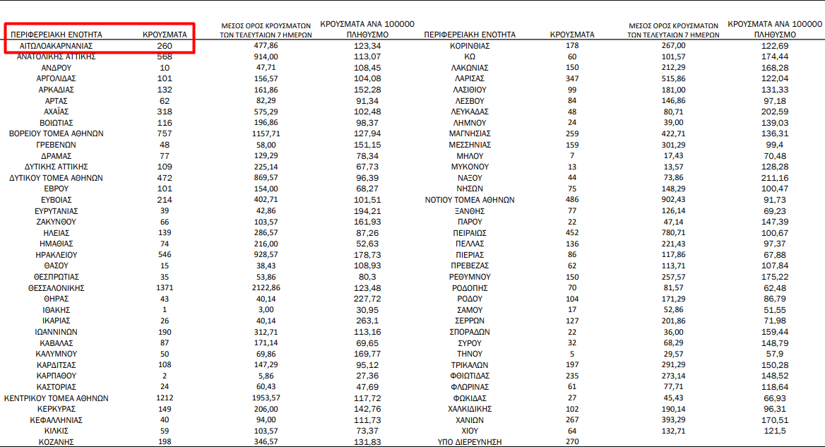 Η κατανομή των 12.437 νέων εγχώριων κρουσμάτων ανά Περιφερειακή Ενότητα παρουσιάζεται στον κατωτέρω πίνακα: