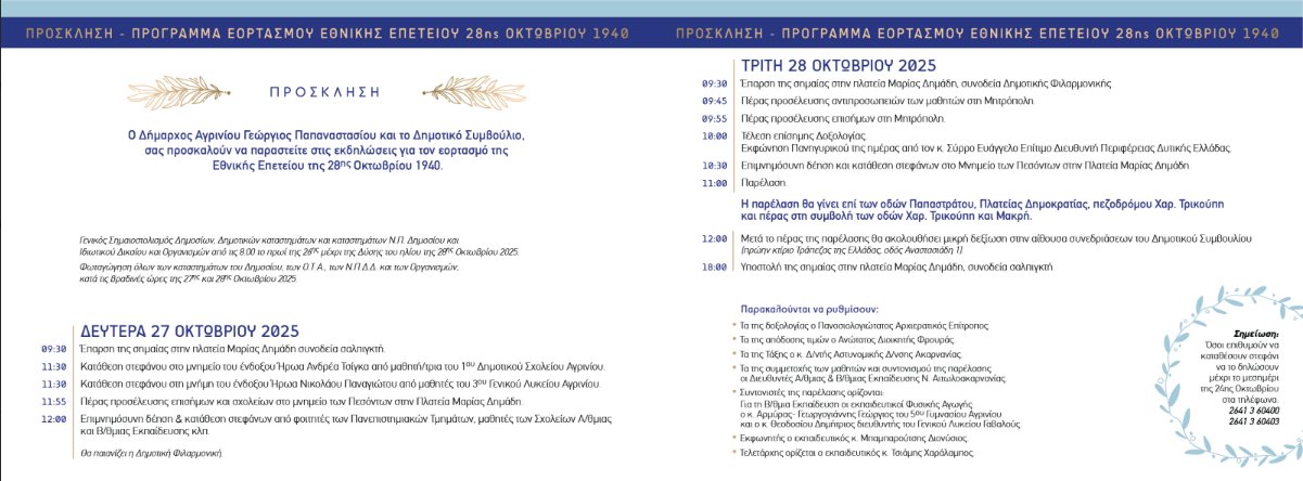 Ο Δήμαρχος Αγρινίου Γεώργιος Παπαναστασίου και το Δημοτικό Συμβούλιο, σας προσκαλούν να παραστείτε στις εκδηλώσεις για τον εορτασμό της Εθνικής Επετείου της 28ης Οκτωβρίου 1940.