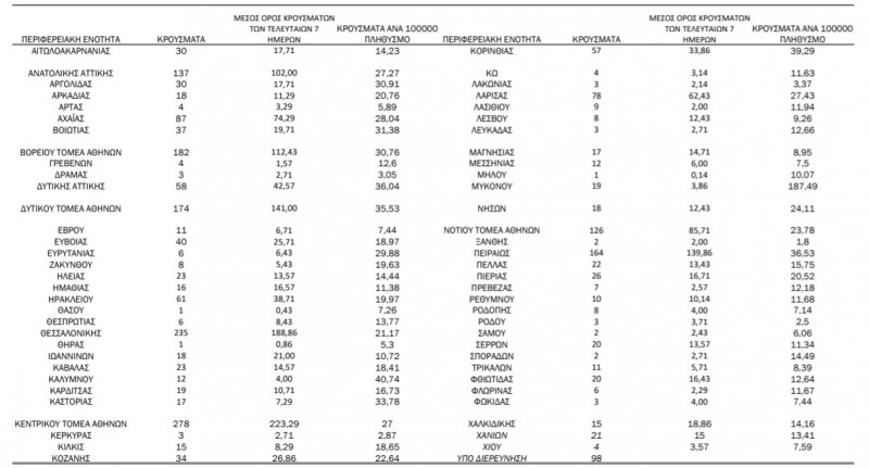 Από το σύνολο των 2.405 νέων κρουσμάτων του νέου ιού στη χώρα 15 είναι εισαγόμενα εκ των οποίων 14 εντοπίστηκαν κατόπιν ελέγχων στις πύλες εισόδου της χώρας. Η κατανομή των 2.390 νέων εγχώριων κρουσμάτων ανά Περιφερειακή Ενότητα παρουσιάζεται στον κατωτέρω πίνακα:
