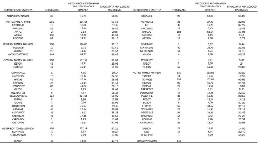 - Η κατανομή των 4.276 νέων εγχώριων κρουσμάτων ανά Περιφερειακή Ενότητα παρουσιάζεται στον κατωτέρω πίνακα.