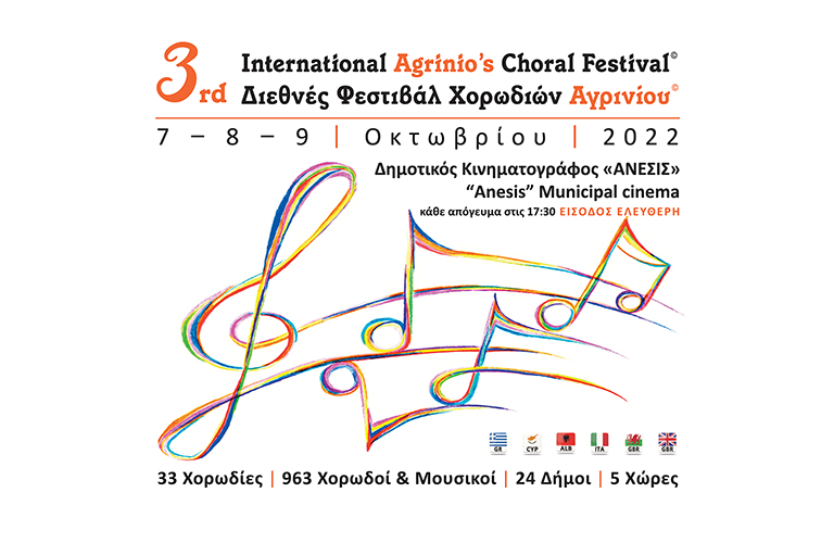 - Το 3ο Διεθνές Φεστιβάλ Χορωδιών Αγρινίου θα διεξαχθεί το τριήμερο 7,8 και 9 Οκτωβρίου, με ώρα έναρξης κάθε απόγευμα στις 17:30 στον Δημοτικό Κινηματογράφο ΑΝΕΣΙΣ στο Αγρίνιο.
