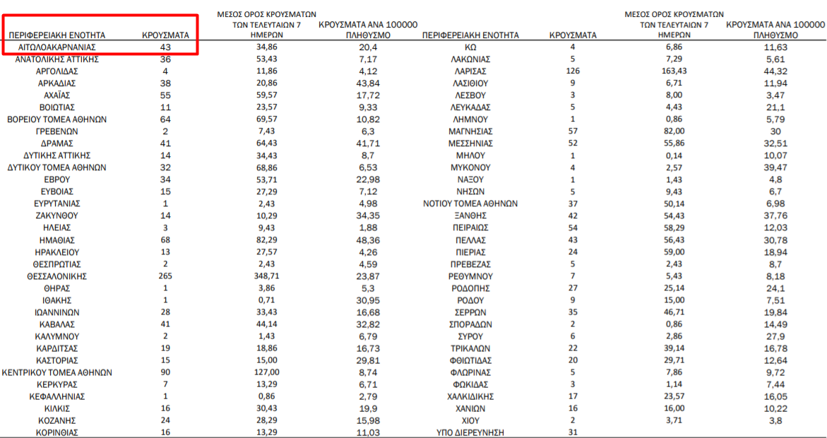 Η κατανομή των 1.696 νέων εγχώριων κρουσμάτων ανά Περιφερειακή Ενότητα παρουσιάζεται στον κατωτέρω πίνακα: