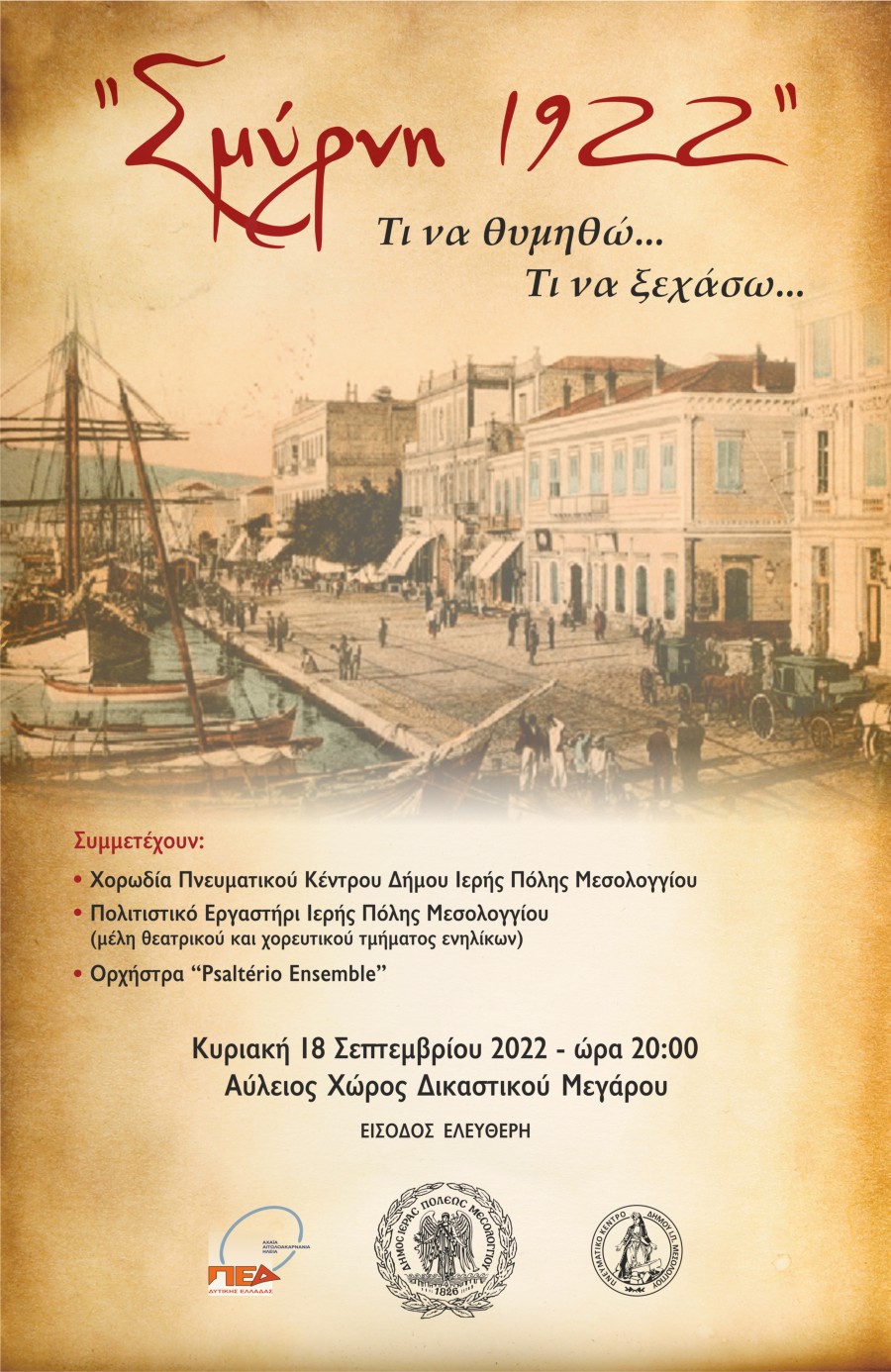 - Ο Σεπτέμβριος είναι ο μήνας μνήμης του μικρασιατικού και ευρύτερα του προσφυγικού Ελληνισμού, και ειδικά φέτος, που συμπληρώνονται 100 χρόνια από την Μικρασιατική Καταστροφή του 1922, την ερχόμενη Κυριακή ο Δήμος Ι.Π. Μεσολογγίου διοργανώνει μια σπουδαία αφιερωματική εκδήλωση με τίτλο: «Σμύρνη 1922, τι να θυμηθώ, τι να ξεχάσω…..».