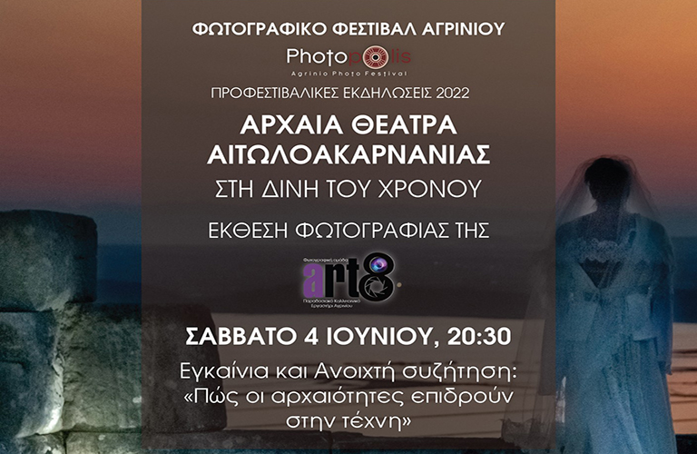 Στον ίδιο χώρο από την Παρασκευή 3 Ιουνίου μέχρι Κυριακή 5 Ιουνίου θα λειτουργεί έκθεση φωτογραφίας της φωτογραφικής ομάδας “art8” με θέμα: «Αρχαία Θέατρα Αιτωλοακαρνανίας στη δίνη του χρόνου».