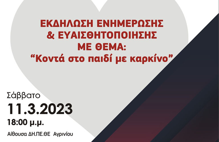 Η Διεύθυνση Κοινωνικής Προστασίας και Δημόσιας Υγείας & το Κοινωνικό Ιατρείο του Δήμου Αγρινίου, σε συνδιοργάνωση με τη «Φλόγα» – Σύλλογος Γονιών Παιδιών με Νεοπλασματική Ασθένεια και τον Ιατρικό Σύλλογο Αγρινίου, σας προσκαλούν στην ενημερωτική εκδήλωση με θέμα: «Κοντά στο Παιδί με Καρκίνο».
