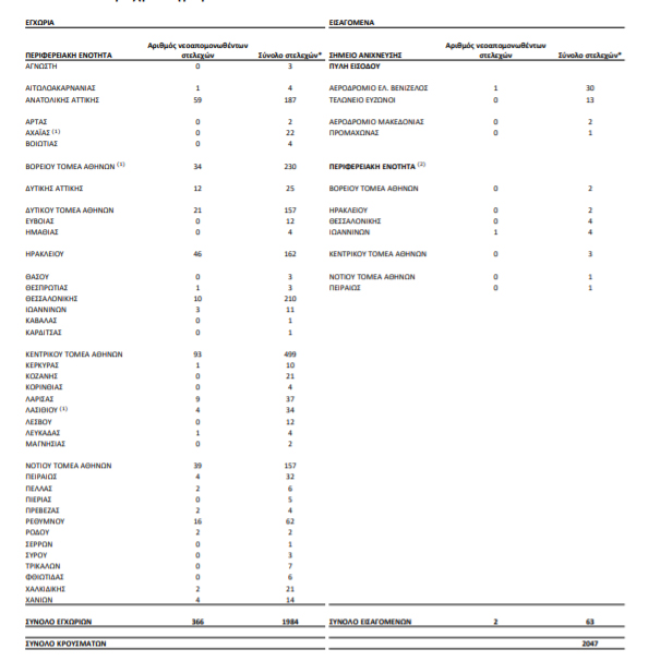 Συνολικά έχουν ταυτοποιηθεί 2.047 θετικά για την παρουσία μετάλλαξης Β.1.1.7/UK lineage (Variant VOC_202012) και 51 θετικά για την παρουσία μετάλλαξης B.1.351/South Africa (Variant 501.V2) από την έναρξη λειτουργίας του Εθνικού Δικτύου Γονιδιωματικής Επιτήρησης για τις μεταλλάξεις του SARS- CoV-2 έως σήμερα.