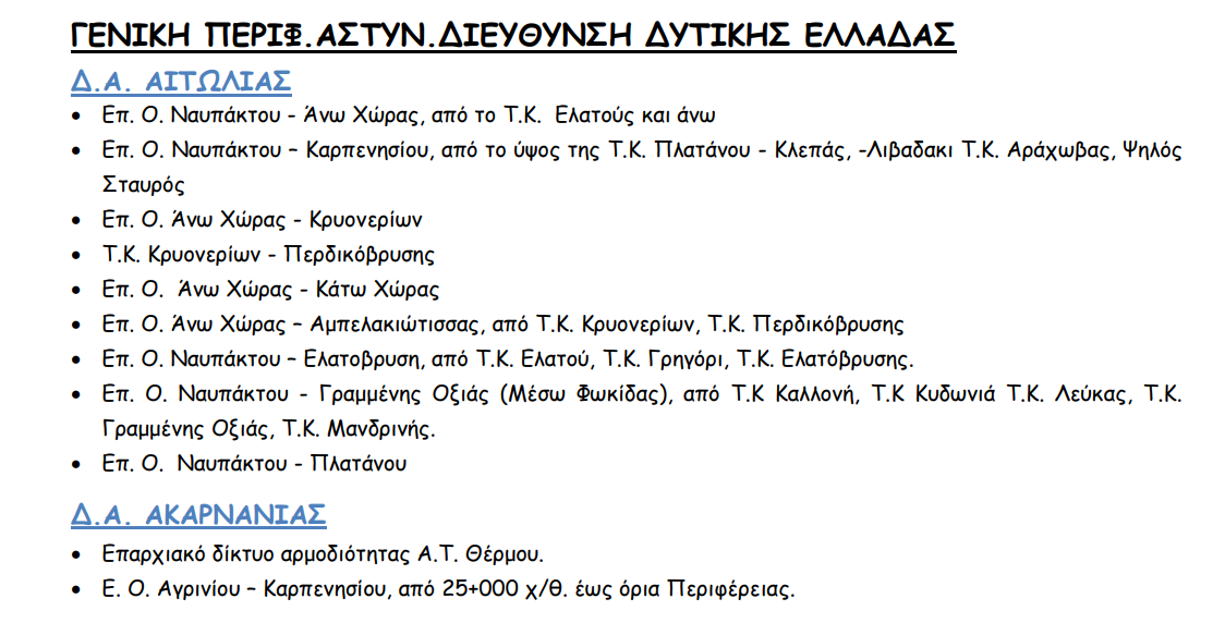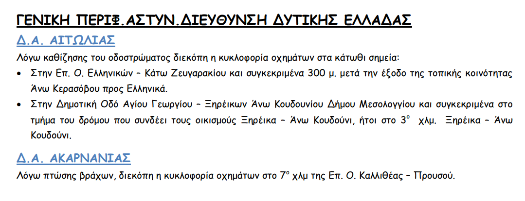 Σύμφωνα με την Γενική Περιφερειακή Αστυνομική Διεύθυνση της Δυτικής Ελλάδας, οι δρόμοι που είναι κλειστοί ή οι οδηγοί αντιμετωπίζουν αντιμετωπίζουν δυσχέρεια στην κυκλοφορία σήμερα Τετάρτη είναι οι παρακάτω: