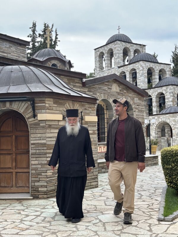 Εκεί, μαζί με τον πατέρα Ισαάκ και την ομάδα του, συμμετέχει στην προετοιμασία του γεύματος για τους μοναχούς: ρεβύθια με κριθαράκι και λαχανικά, μελιτζανοσαλάτα και ένα ξεχωριστό νηστίσιμο γαλακτομπούρεκο.