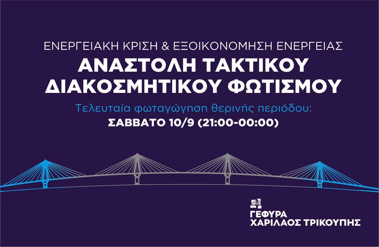 - Λαμβάνοντας υπ’ όψιν την τρέχουσα ενεργειακή κρίση και προκειμένου να μειωθεί η κατανάλωση ενέργειας -ειδικότερα κατά τη διάρκεια των χειμερινών μηνών- η ΓΕΦΥΡΑ Α.Ε. προχωρεί στη λήψη επιπλέον μέτρων εξοικονόμησης, περιλαμβάνοντας σε αυτά και τον τακτικό διακοσμητικό φωτισμό της Γέφυρας Ρίου – Αντιρρίου.
