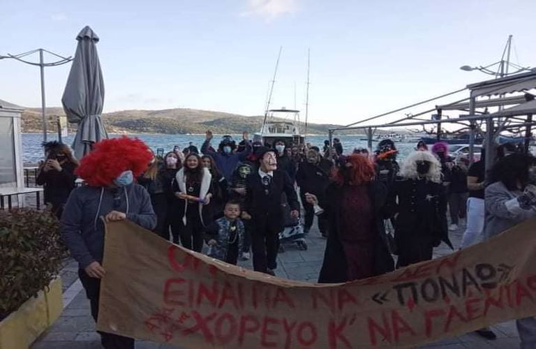 - Με κέφι και χιούμορ, η ομάδα, με Αποκριάτικες φορεσιές, διέσχισε τους κεντρικούς δρόμους του Αστακού κρατώντας ένα πανό που έγραφε «Οι πλατείες δεν είναι για να “πονάω” αλλά για να χορεύω και να γλεντάω».