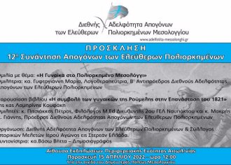 12η Συνάντηση Απογόνων των Ελεύθερων Πολιορκημένων του Μεσολογγίου Αίθουσα εκδηλώσεων Περιφεριακής Ενότητας Αιτωλ/νίας Παρασκεύη 15 Απριλίου…