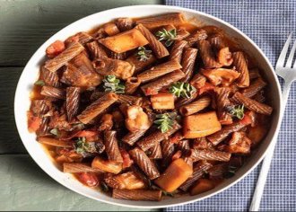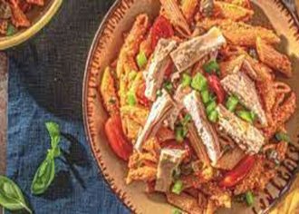Μια διαφορετική σαλάτα ζυμαρικών από πέννες κόκκινης φακής, που συνδυάζονται υπέροχα με την κρύα σάλτσα κόκκινης…