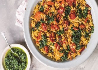 Ένα νόστιμο και χυλωμένο, χορτοφαγικό κριθαράκι φούρνου, με τη δροσιά των διάφορων μυρωδικών, αλλά και τη σπιρτάδα…