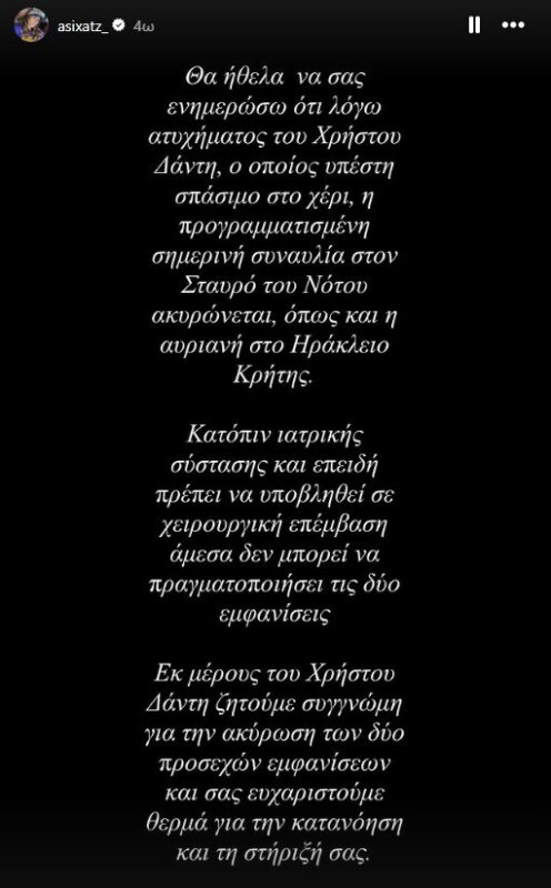 Εκ μέρους του Χρήστου Δάντη ζητούμε συγνώμη για την ακύρωση των δύο προσεχών εμφανίσεων και σας ευχαριστούμε θερμά για την κατανόηση και τη στήριξή σας», ανέφερε στο post που έκανε στο Instagram το πρωί της 13ης Φεβρουαρίου η σύντροφός του, Ασημίνα Χατζηανδρέου.