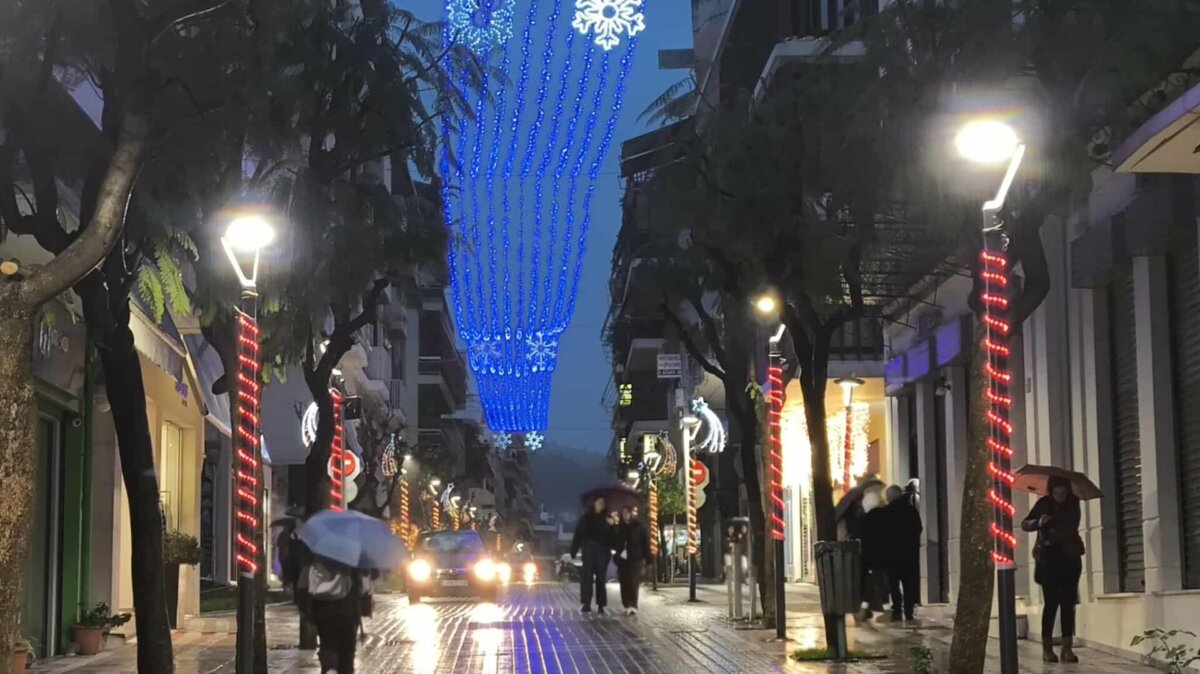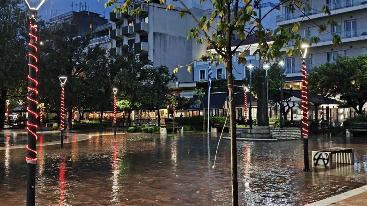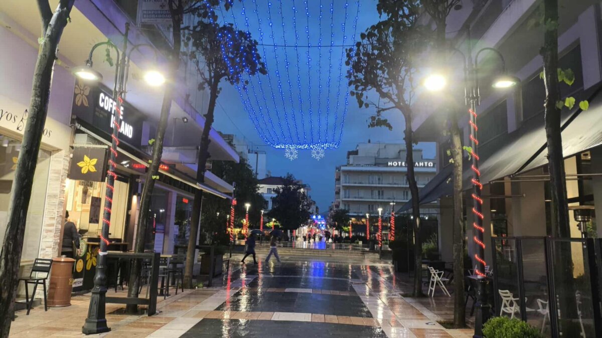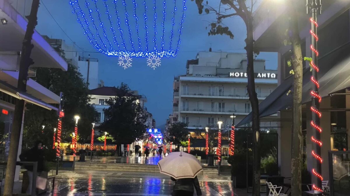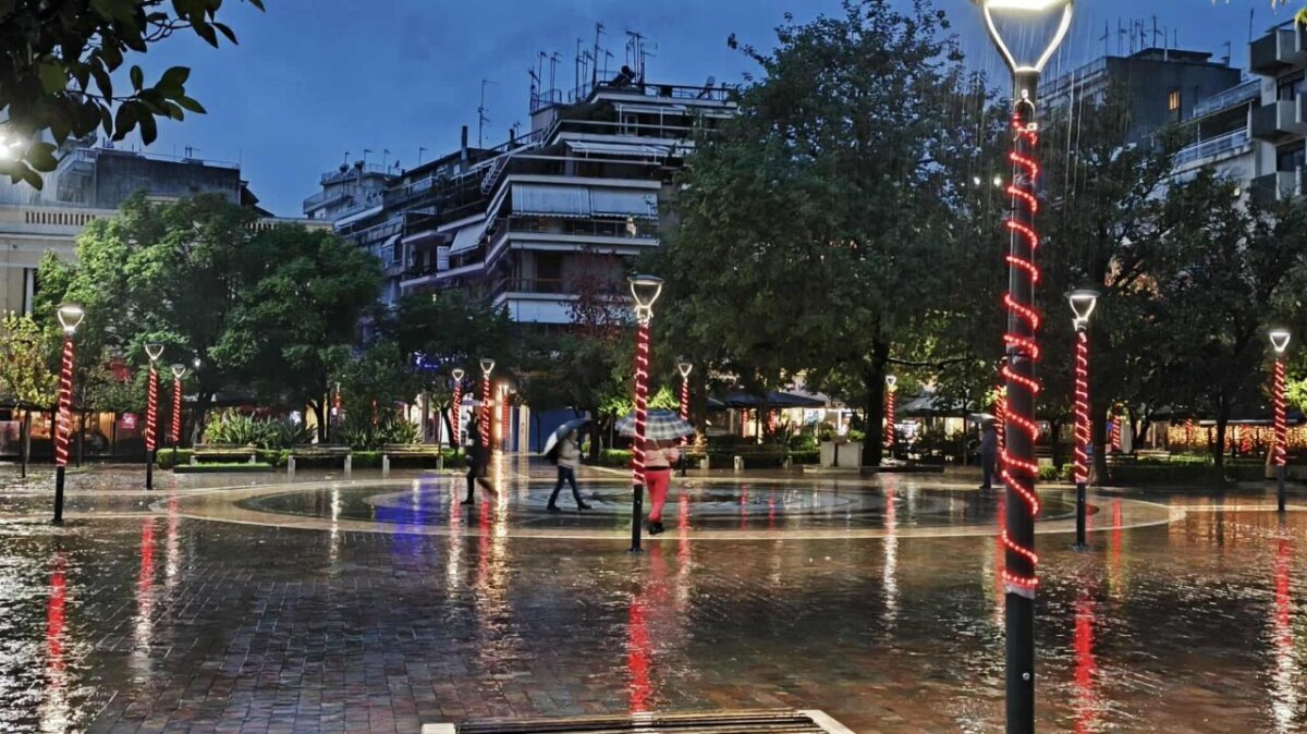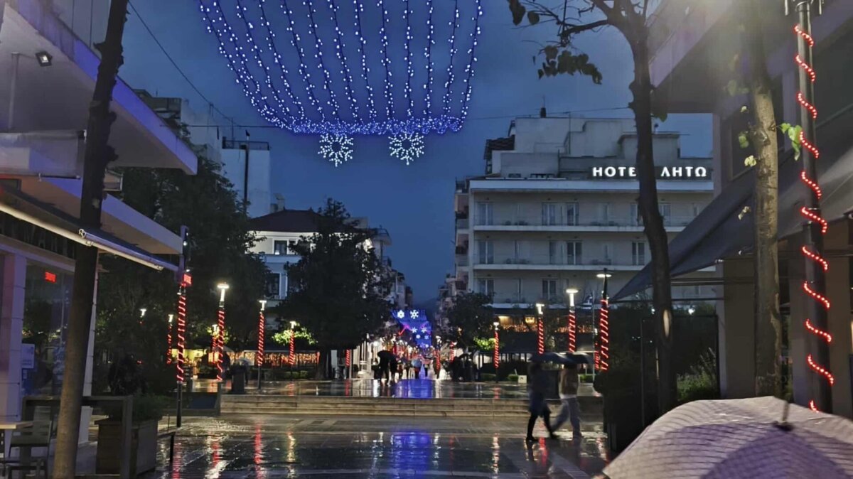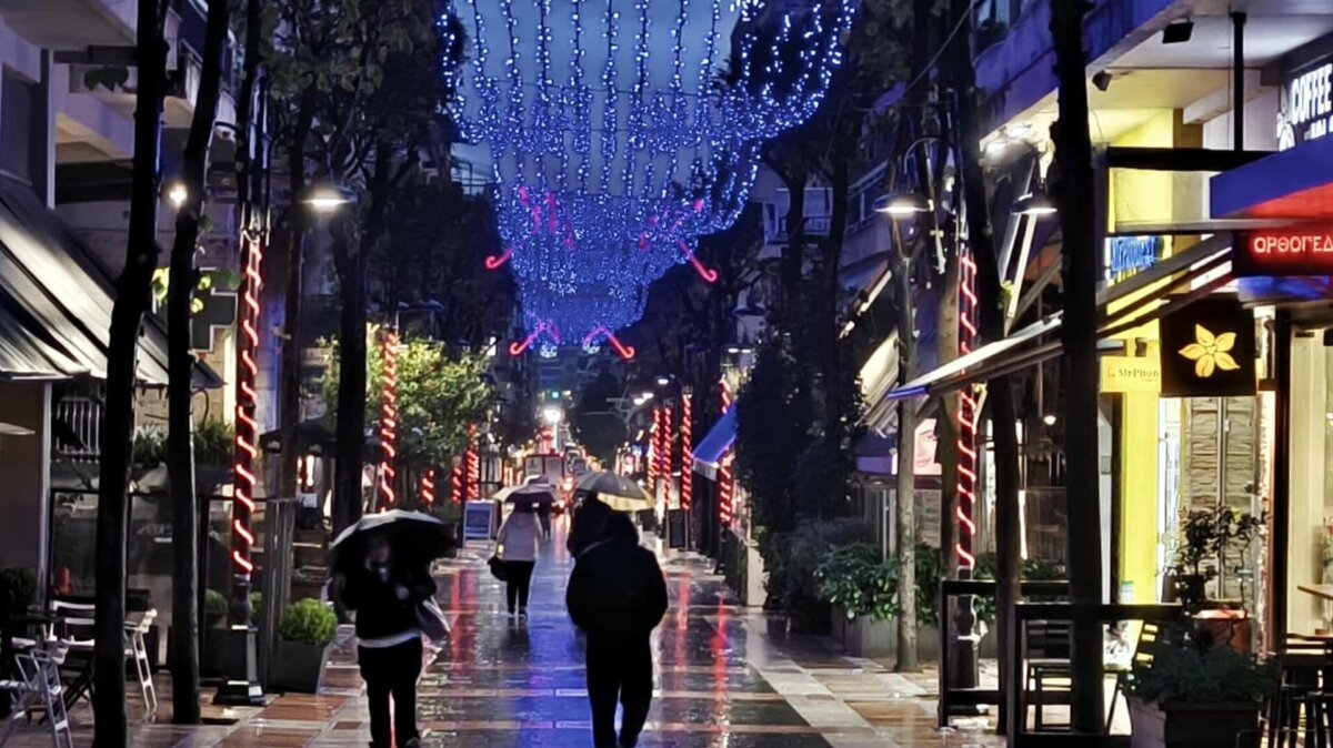 Η λαμπερή εικόνα του κέντρου, παρά την έντονη βροχόπτωση, δημιουργεί μια ευχάριστη ατμόσφαιρα.