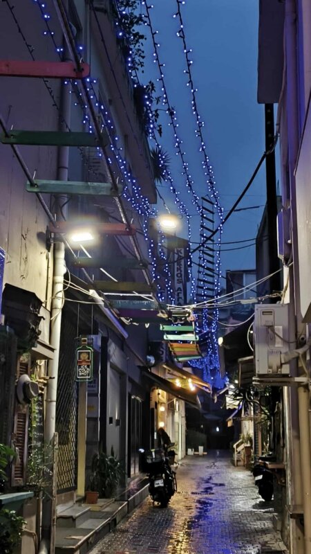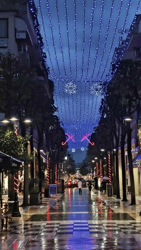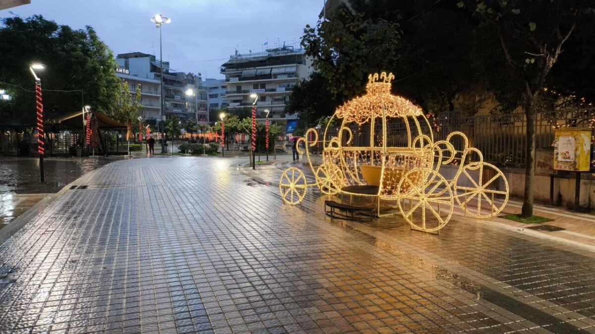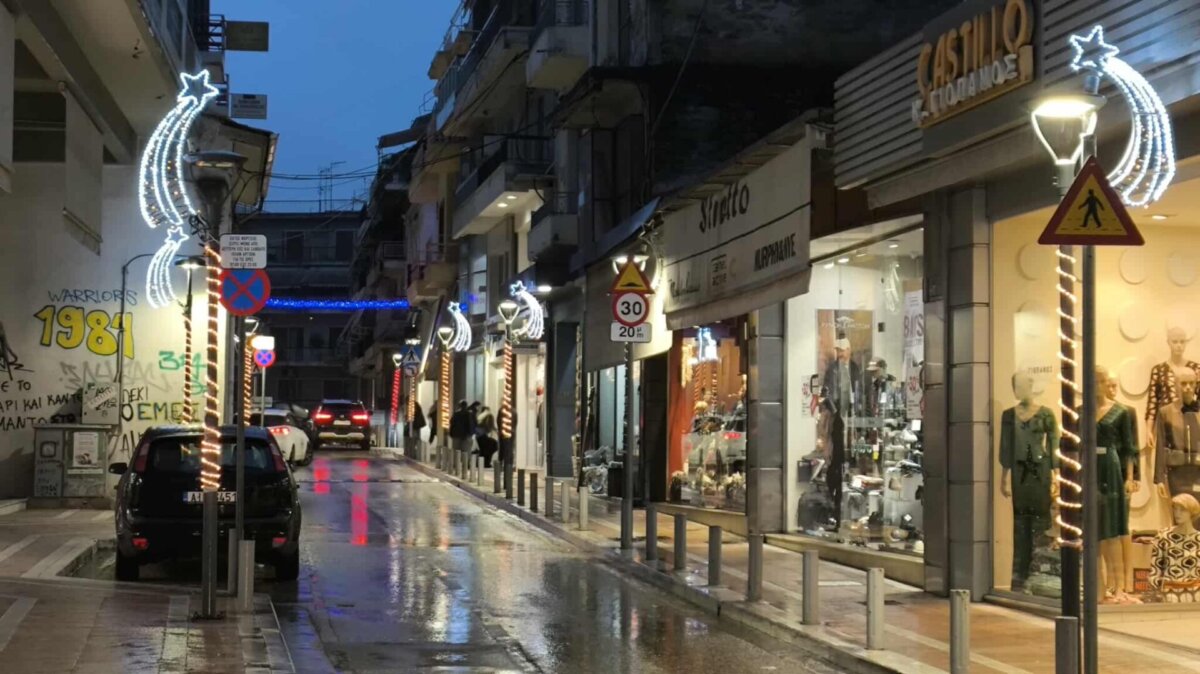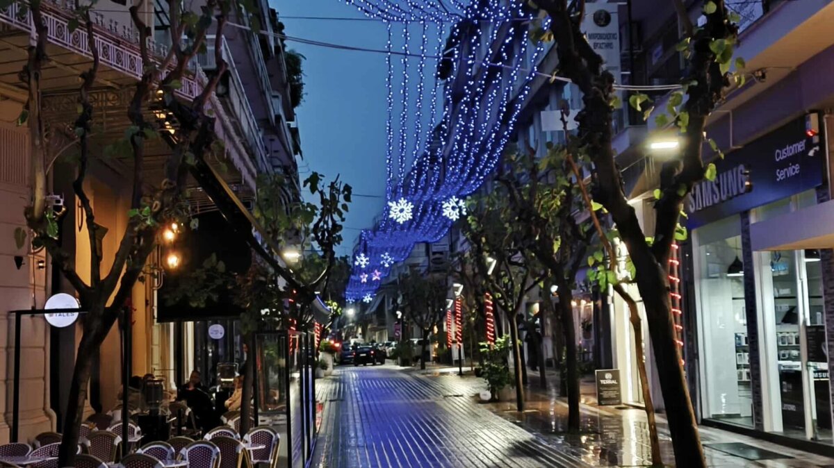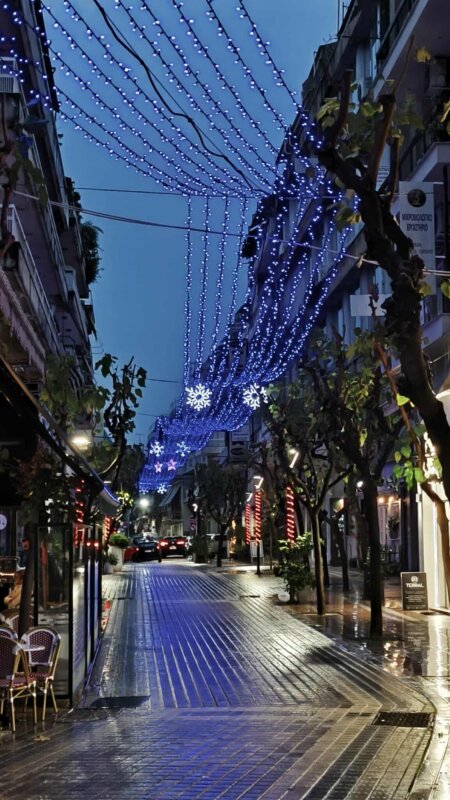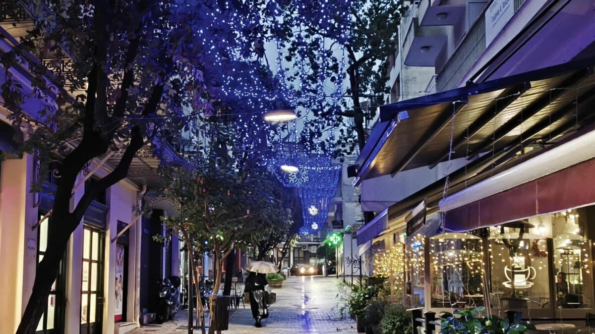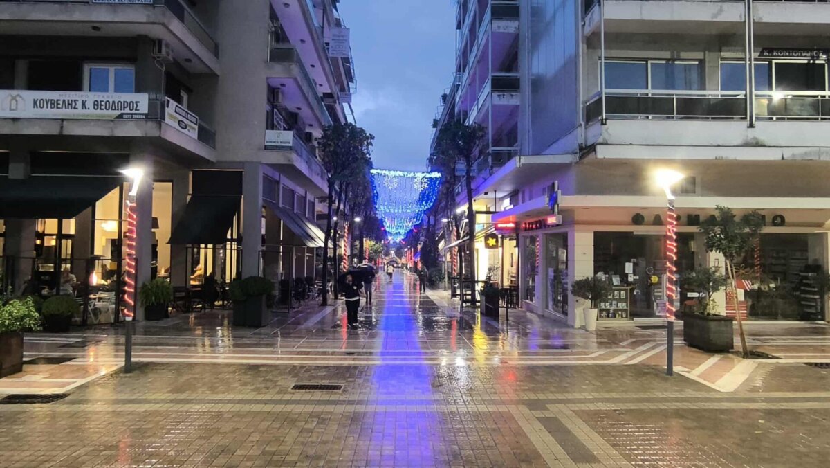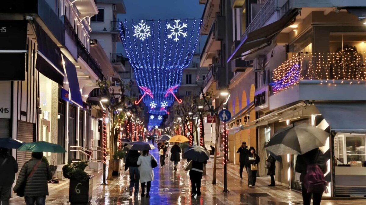 Η λαμπερή εικόνα του κέντρου, παρά την έντονη βροχόπτωση, δημιουργεί μια ευχάριστη ατμόσφαιρα.