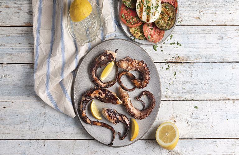 Λαδώνουμε τα πλοκάμια, την κουκούλα, και τα ψήνουμε στο μπάρμπεκιου για 3-4 λεπτά από κάθε πλευρά μέχρι να ροδίσουν.