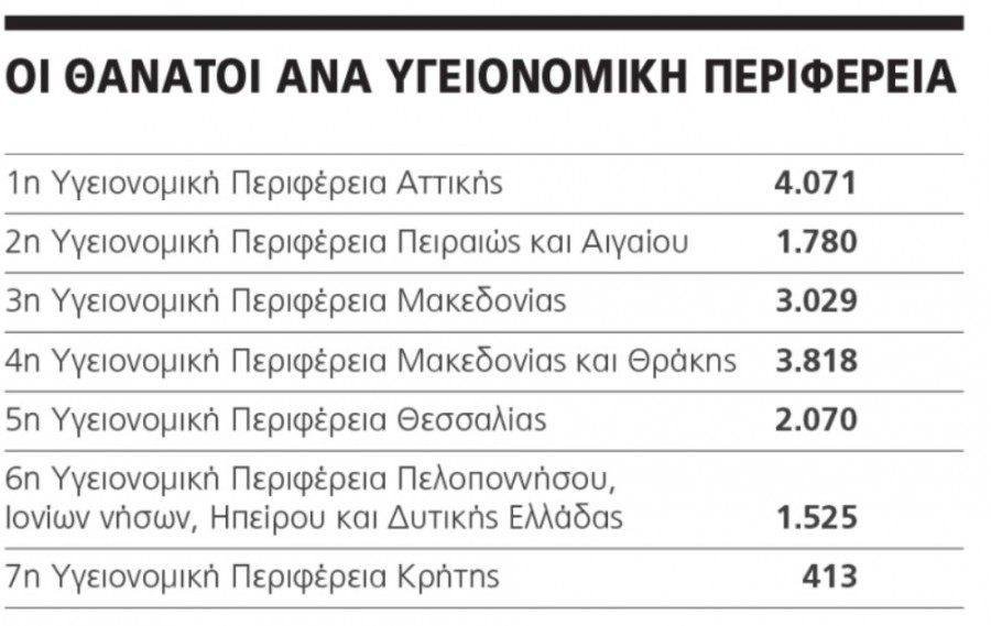 Άλλοι 5.851 νεκροί είναι ο απολογισμός της πανδημίας για την Αττική των 3,8 εκατομμυρίων κατοίκων και 3.600 είναι τα θύματα του κορωνοϊού στην Πελοπόννησο, στη Θεσσαλία, στην Ήπειρο και τα Ιόνια νησιά. Τέλος, 413 νεκροί είχαν δηλωθεί, μέχρι και την περασμένη Πέμπτη, στα νοσοκομεία της Κρήτης.