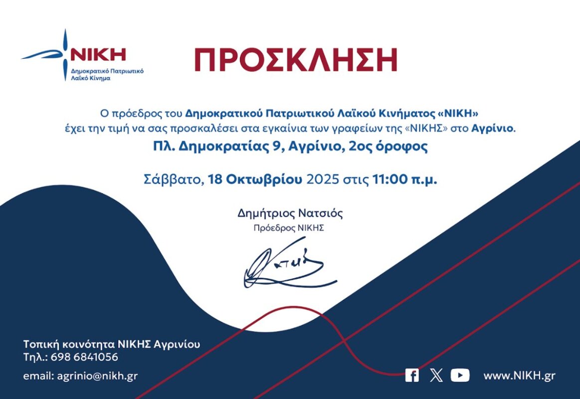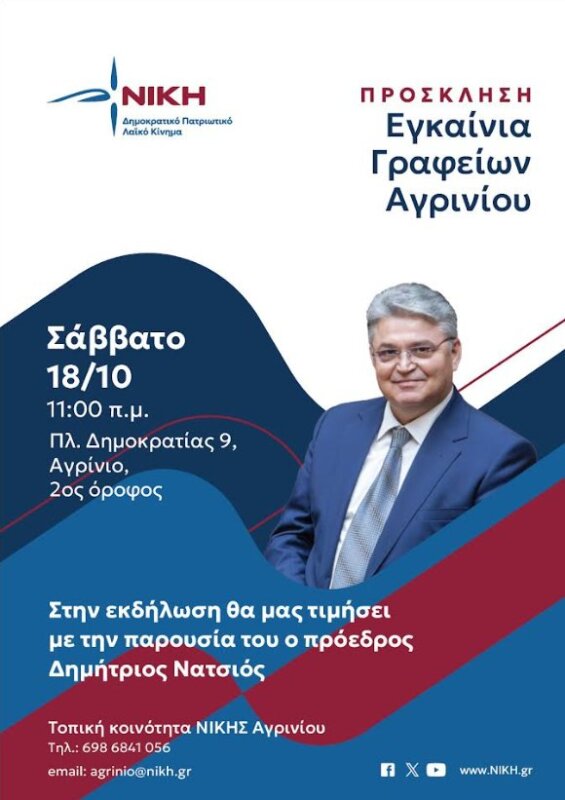 Το Σάββατο, 18 Οκτωβρίου, στις 11:00 το πρωί, θα πραγματοποιηθούν τα εγκαίνια των γραφείων του κόμματος «ΝΙΚΗ – Δημοκρατικό Πατριωτικό Λαϊκό Κίνημα» στο Αγρίνιο.