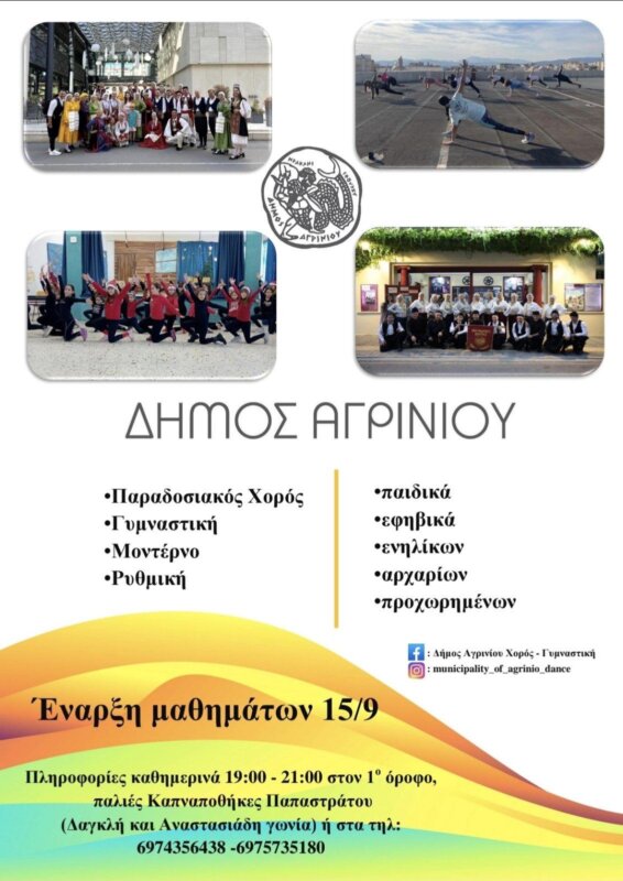 Ο Δήμος Αγρινίου γνωστοποιεί πως από τις 15/09 Χοροί και Γυμναστική για μικρούς και μεγάλους στις Παλαιές Καπναποθήκες Παπαστράτου