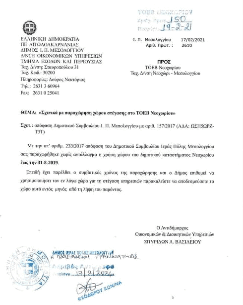 Στο παρακάτω έγγραφο, χθες ξαφνικά και απροειδοποίητα ο Δήμος Μεσολογγίου έστειλε έξωση στο ΤΟΕΒ Νεοχωρίου και μάλιστα να αδειάσουν το γραφείο εντός μηνός.