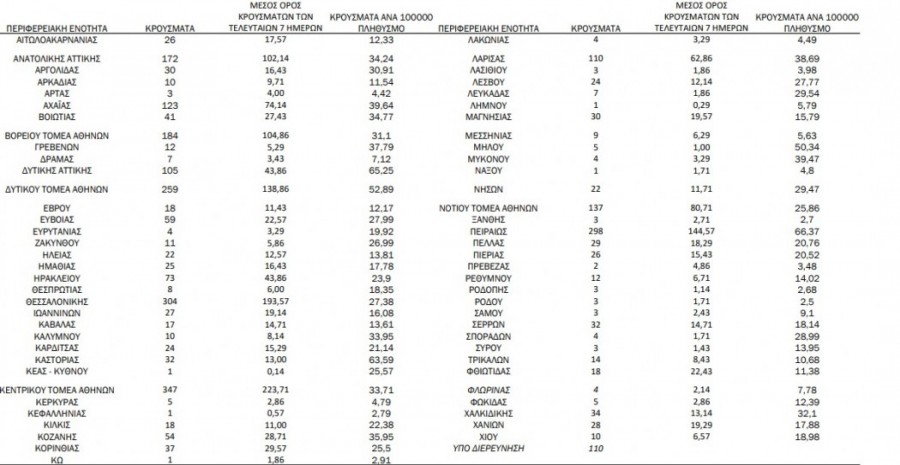 - Η κατανομή των 3.068 νέων εγχώριων κρουσμάτων ανά Περιφερειακή Ενότητα παρουσιάζεται στον κατωτέρω πίνακα.