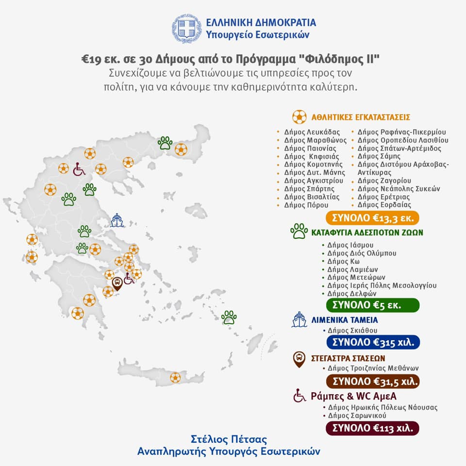 Έργα συνολικού ύψους 19 εκατ. ευρώ για 30 δήμους της χώρας εντάχθηκαν στο αναπτυξιακό πρόγραμμα «Φιλόδημος ΙΙ», με αποφάσεις που υπέγραψε ο αναπληρωτής υπουργός Εσωτερικών, Στέλιος Πέτσας.