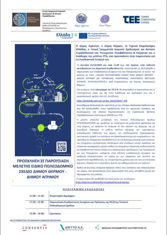 Ο Δήμος Αγρινίου, ο Δήμος Θέρμου, το Τεχνικό Επιμελητήριο Ελλάδας, η Γενική Γραμματεία Χωρικού Σχεδιασμού και Αστικού Περιβάλλοντος του Υπουργείου Περιβάλλοντος & Ενέργειας, καθώς και ο Ανάδοχος της Μελέτης Ε.Π.Σ., προσκαλούν τους πολίτες, τους φορείς και τα ΜΜΕ στην επίσημη παρουσίαση των Εναλλακτικών Σεναρίων και του Προκρινόμενου Σεναρίου της μελέτης: