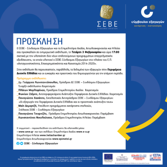 - Ενημερωτική εκδήλωση , σε επίπεδο Περιφέρειας Δυτικής Ελλάδας, σχετικά με την υλοποίηση δύο νέων επιδοτούμενων προγραμμάτων επαγγελματικής εξειδίκευσης πραγματοποιεί ο Σ.Ε.Β.Ε., την Τετάρτη 3 Φεβρουαρίου και ώρα 17:00, μέσω των ιστοσελίδων του Σ.Ε.Β.Ε. (www.seve.gr) και των Επιμελητηρίων Αχαΐας, Αιτωλοακαρνανίας και Ηλείας καθώς και των σελίδων κοινωνικής δικτύωσης των φορέων.