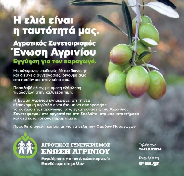 Οι παραγωγοί καλούνται να προσέρχονται στις εγκαταστάσεις της Ένωσης Αγρινίου στη Σπολάϊτα, όπου και το εργοστάσιο επεξεργασίας – τυποποίησης βρώσιμης ελιάς, καθώς και στο υποκατάστημα της Αμφιλοχίας.