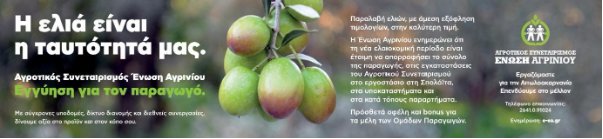 Η Ένωση Αγρινίου, με την Ολοκληρωμένη Διαχείριση που εφαρμόζει (κατά agro 2.1 – 2.2), με τις υποδομές που έχει δημιουργήσει (εργοστάσιο, δίκτυο διανομής), με τη δυναμική και τις συνεργασίες που έχει αναπτύξει στη χώρα και στο εξωτερικό και με την εμπειρία δεκαετιών στο χώρο, εγγυάται το καλύτερο για τους ελαιοπαραγωγούς, με πλήρη διασφάλιση του εισοδήματός τους.
