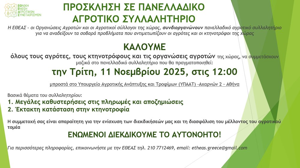 Πιο συγκεκριμένα, η διαμαρτυρία αποφασίστηκε να πραγματοποιηθεί την Τρίτη, 11 Νοεμβρίου 2025, στις 12:00, στο Υπουργείο Αγροτικής Ανάπτυξης και Τροφίμων, με τη συμμετοχή Αγροτικών Συνεταιρισμών, Αγροτικών Συλλόγων, Ομοσπονδιών, Παραγωγών και Κτηνοτρόφων από όλη τη χώρα.