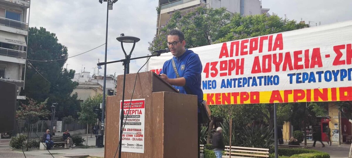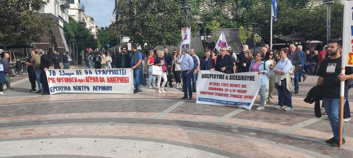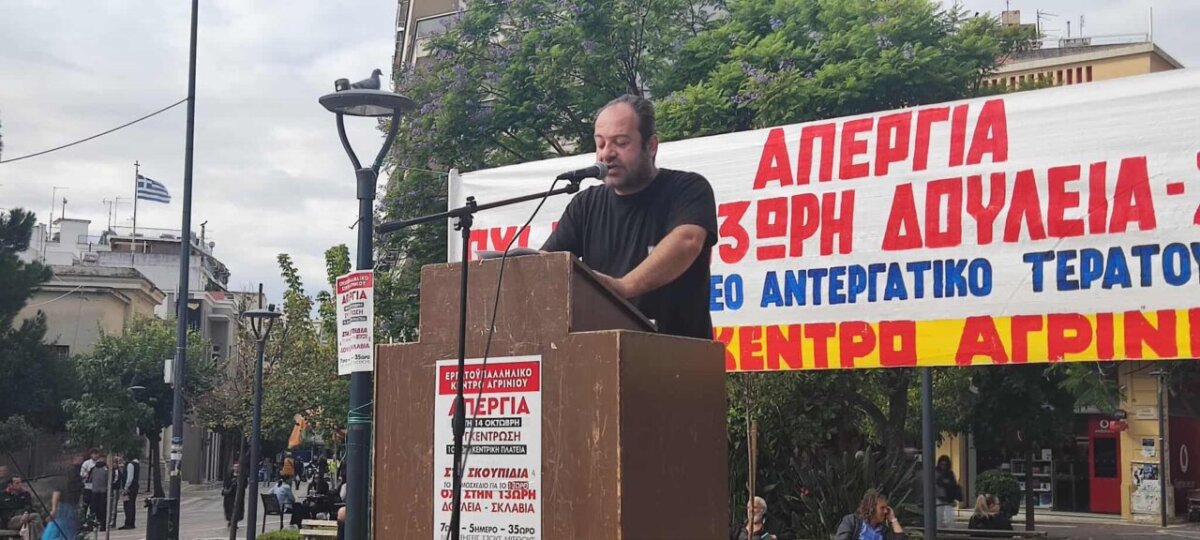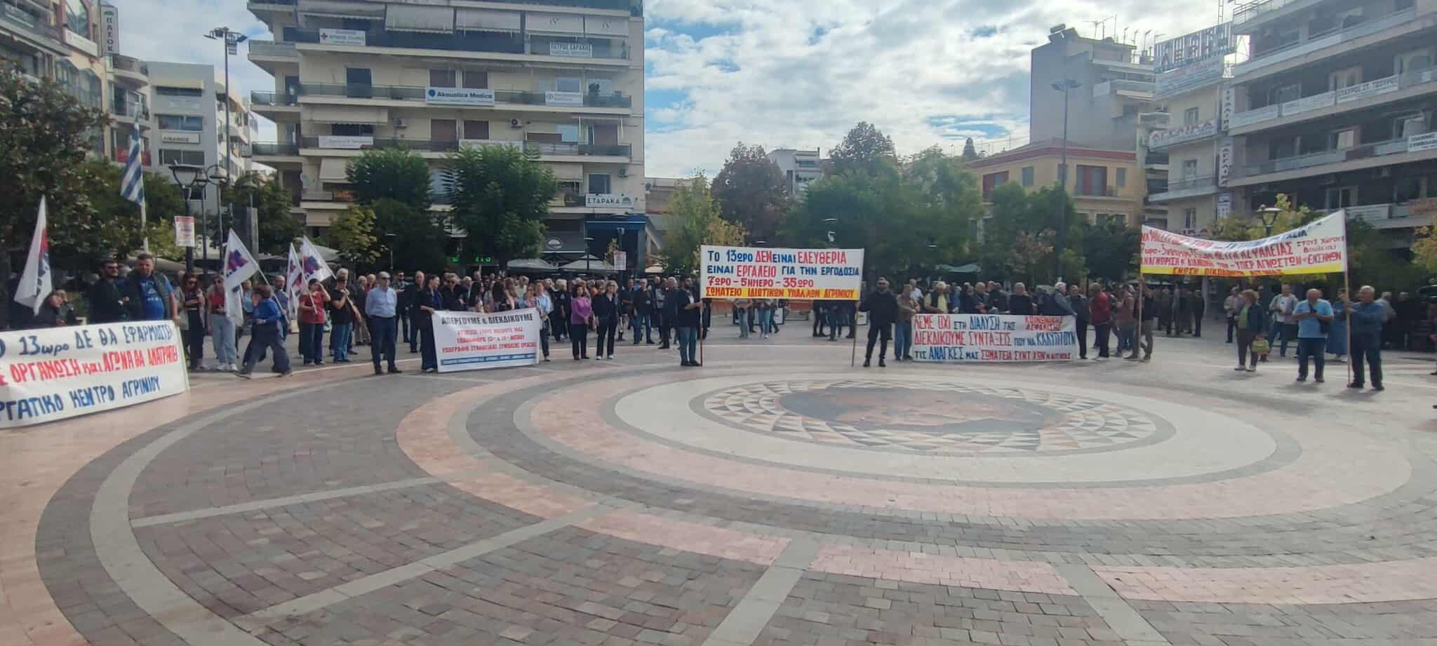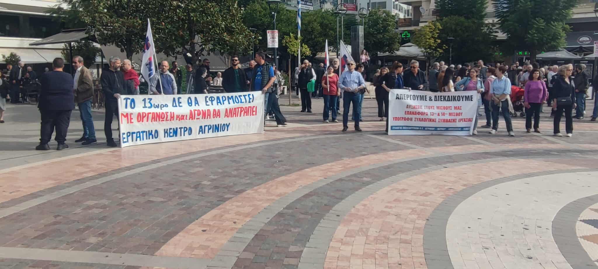 Μαζική απεργιακή συγκέντρωση πραγματοποιήθηκε το πρωί της Τρίτης (14/10) στην Πλατεία Δημοκρατίας στο Αγρίνιο, με αίτημα να μην περάσει το εργασιακό νομοσχέδιο που προβλέπει εργασία έως και 13 ώρες ημερησίως.