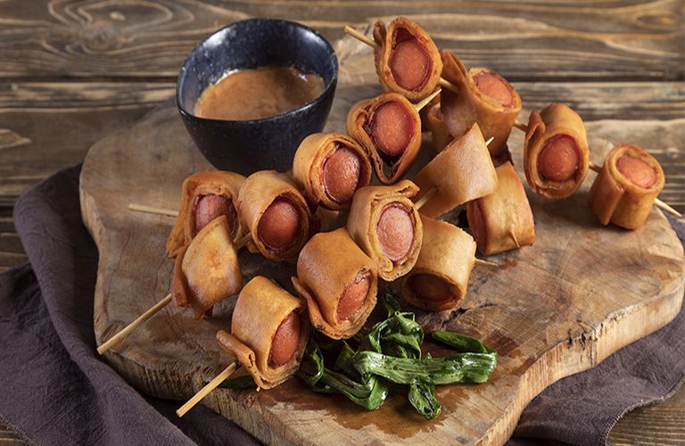 Κόβουμε το κάθε ρολό σε 6 ροδέλες και τις περνάμε από καλαμάκια από σουβλάκια.