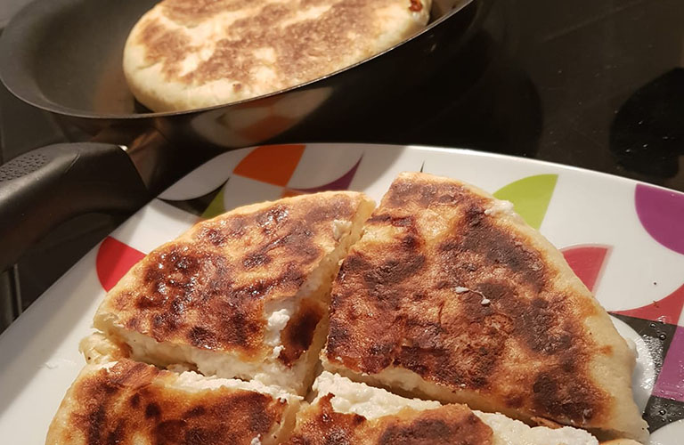 Βάζουμε το τηγάνι να ζεσταθεί και βάζουμε την πίτα μας στο τηγάνι να ψηθεί χωρίς το βούτυρο σε χαμηλή φωτιά. Ψήνουμε με κλειστό καπάκι για 3-5 λεπτά από την κάθε μεριά. Αφού γίνει την περνάμε με το βούτυρο. Περιμένουμε για 7-10 λεπτά και την κόβουμε στην μέση ή στα 4. Συνεχίζουμε την ίδια διαδικασία και με τις υπόλοιπες μερίδες.