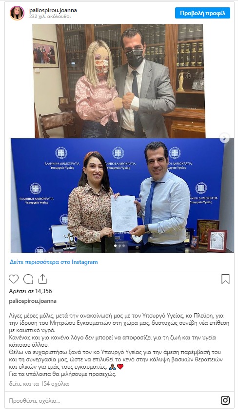 «Λίγες μέρες μόλις, μετά την ανακοίνωσή μας με τον Υπουργό Υγείας, κο. Πλεύρη, για την ίδρυση του Μητρώου Εγκαυματιών στη χώρα μας, δυστυχώς συνέβη νέα επίθεση με καυστικό υγρό. Κανένας και για κανένα λόγο δεν μπορεί να αποφασίζει για τη ζωή και την υγεία κάποιου άλλου. Θέλω να ευχαριστήσω ξανά τον κο Υπουργό Υγείας για την άμεση παρέμβασή του και τη συνεργασία μας, ώστε να επιλυθεί το κενό στην κάλυψη βασικών θεραπειών και υλικών για εμάς τους εγκαυματίες. Για τα υπόλοιπα θα μιλήσουμε προσεχώς», γράφει στην ανάρτησή της η Ιωάννα.