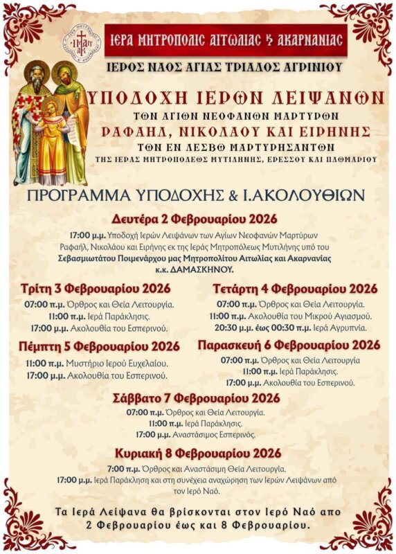Ο Ιερός Ναός Αγίας Τριάδος Αγρινίου υποδέχθηκε παρουσία του Μητροπολίτη Δαμασκηνού το απόγευμα της Δευτέρας, 2 Φεβρουαρίου 2026 τα λείψανα των Αγίων Ραφαήλ, Νικολάου και Ειρήνης.