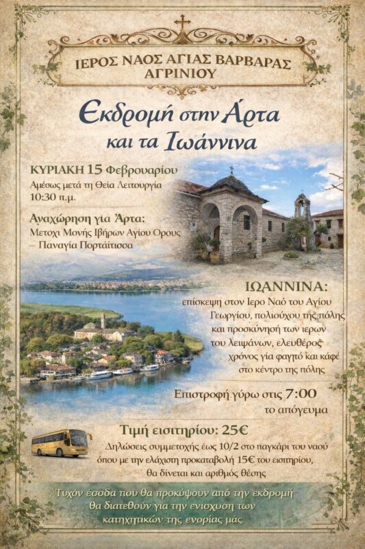 Ο Ιερός Ναός Αγίας Βαρβάρας Αγρινίου γνωστοποίησε πως πραγματοποιεί εκδρομή την Κυριακή, 15 Φεβρουαρίου στην Άρτα και τα Ιωάννινα, αμέσως μετά τη Θεία Λειτουργία.