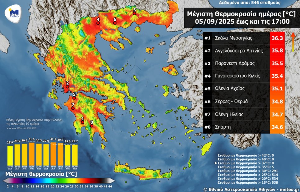 Ιδιαίτερα υψηλές θερμοκρασίες καταγράφηκαν σε πολλές περιοχές της Ελλάδας την Παρασκευή, 5 Σεπτεμβρίου 2025, σύμφωνα με το δίκτυο αυτόματων μετεωρολογικών σταθμών του Εθνικού Αστεροσκοπείου Αθηνών/meteo.gr.