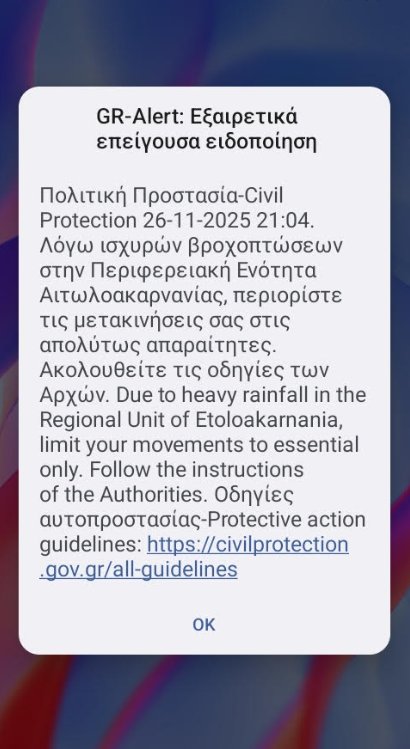 Προειδοποίηση για ισχυρές βροχοπτώσεις από την Πολιτική Προστασία ήχησε το βράδυ της Τετάρτης 26ης Νοεμβρίου 2025 μέσω του 112, προς τους κατοίκους του Αγρινίου αλλά και όλου του Νομού.
