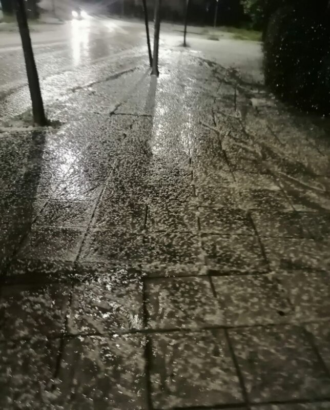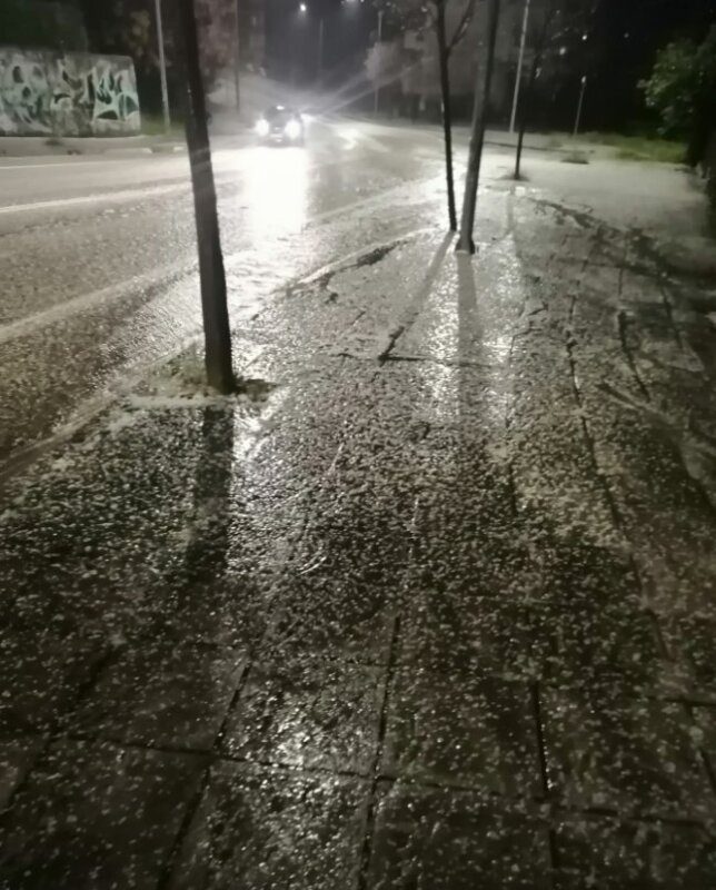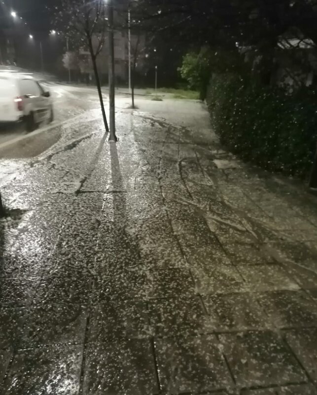 Χαρακτηριστικές είναι οι παρακάτω εικόνες από τον δρόμο της περιμετρικής στο παλιό Νοσοκομείο όπου «στρώθηκε» από χαλάζι ενώ ο ουρανός άστραφτε από κεραυνούς.