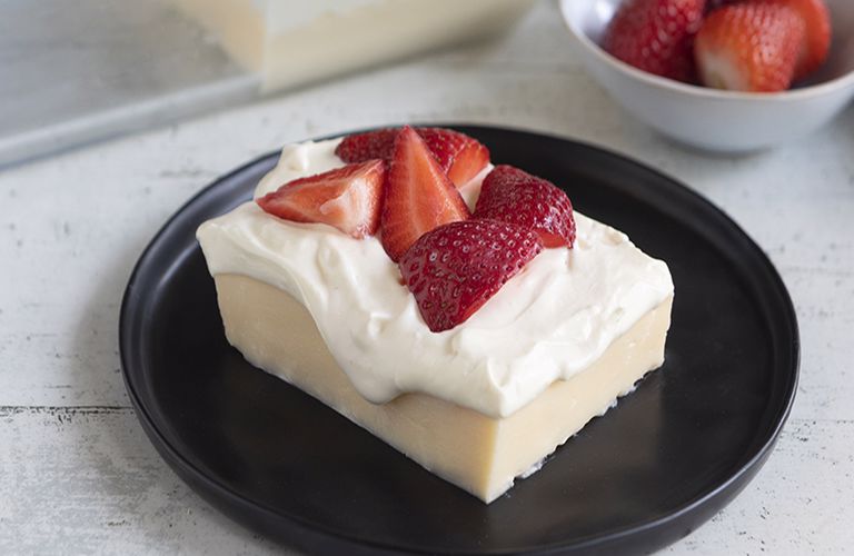 Κόβουμε τις φράουλες σε κομμάτια και τις απλώνουμε πάνω από γλυκό.