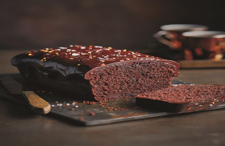 Το αφήνουμε να κρυώσει μέχρι να γίνει πηχτό, αλλά μαλακό, και μετά το απλώνουμε με ένα κουτάλι πάνω από το κέικ, αφήνοντάς το να στάζει ελαφρά στα πλάγια. Το αφήνουμε να σταθεί για 15΄, πασπαλίζουμε με λίγες νιφάδες τσίλι και θαλασσινό αλάτι, το κόβουμε σε φέτες και σερβίρουμε.