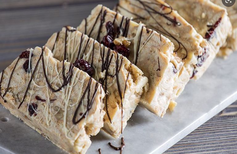Κόβουμε με πριονωτό μαχαίρι και σερβίρουμε με κουβερτούρα και κουβερτούρα λευκή λιωμένες, κράνμπερις και καρύδια.